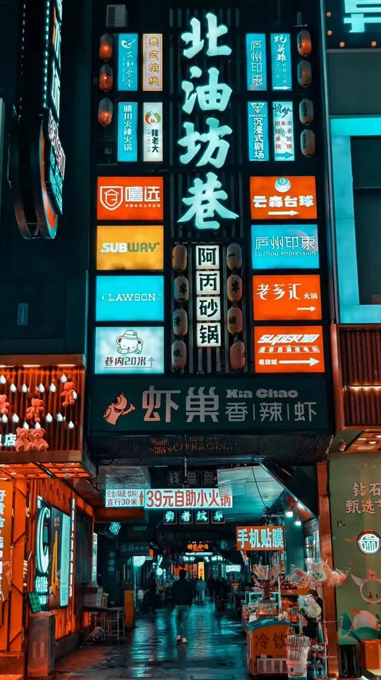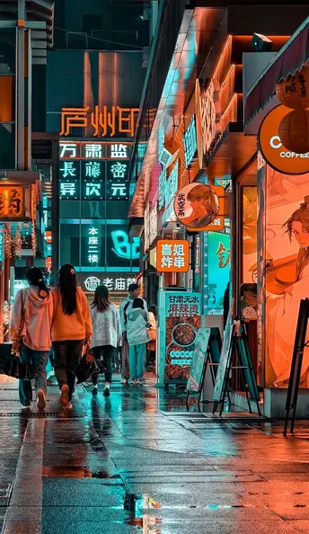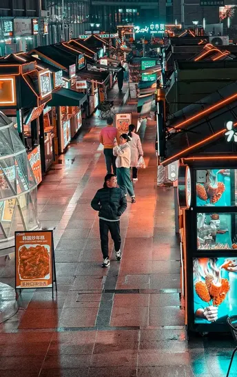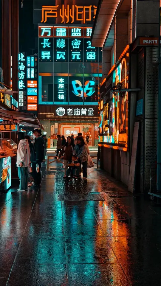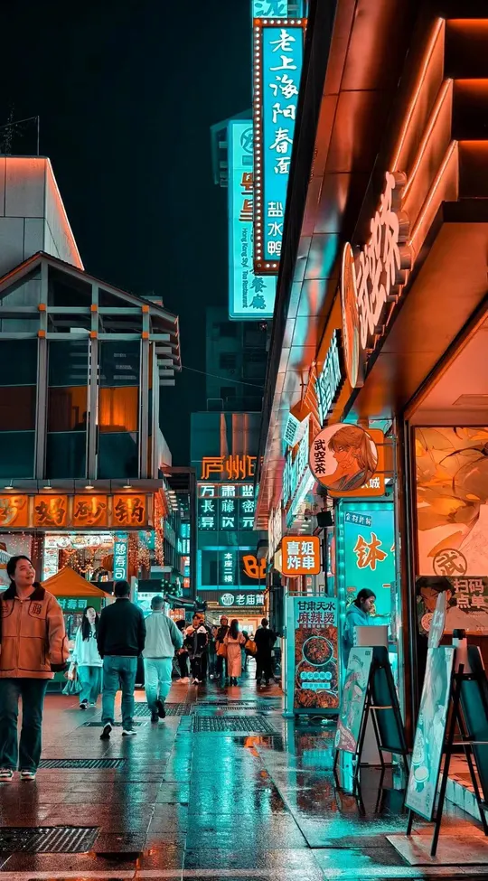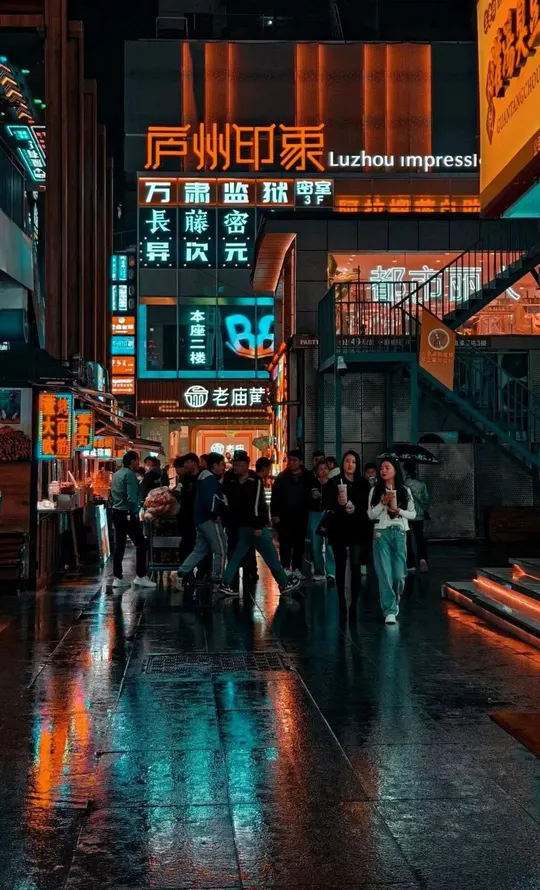 白天下了一场雨,晚上雨停后,人们来到步行街闲逛,雨夜后的步行街更加迷人,光影与路面的灯影,人影交相辉映。