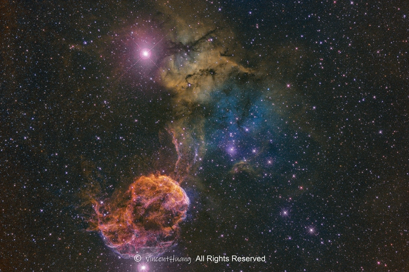 这一宇宙水母是气泡状超新星遗迹IC 443的一部分。 IC 443是一颗大质量恒星爆炸后产生的膨胀的碎片云。 爆炸产生的光在30000多年前首次到达地球。 像其在天文水域中的表亲蟹状星云超新星遗迹一样,IC 443中也有一颗中子星——坍塌恒星残余核心。 水母星云距离我们大约5000光年。 在这个距离上,这张特色照片的跨度大约为140光年。