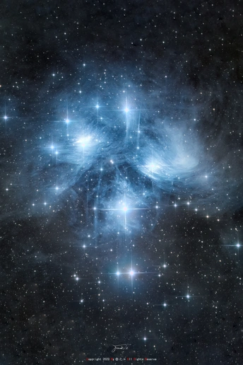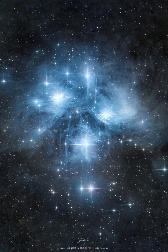 愿你这一生星光相伴,璀璨而耀眼 目标:M45 昴星团 设备:佳能6d改机 拍摄::在四级光污染情况下拍摄,累计曝光一个半小时左右,后期堆栈所得。