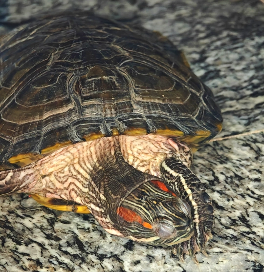 春意萌动,冬眠的乌龟慵懒地用前肢枕着头,享受苏醒的愉悦。