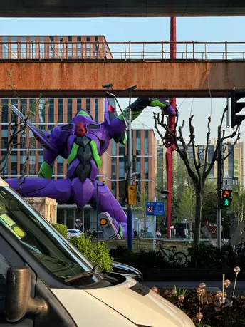 市北工业园区附近曾经的网红打卡地,和啦啦宝都呆呆高达相比,初号机更生动一些。