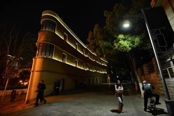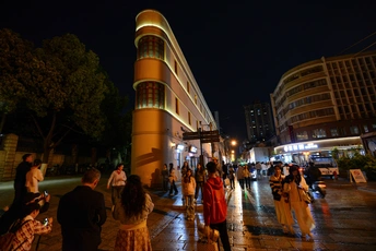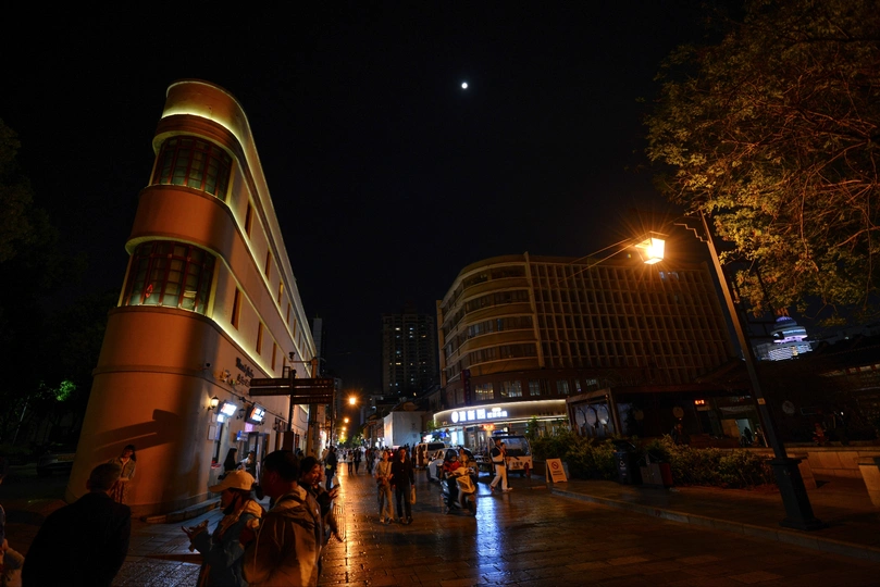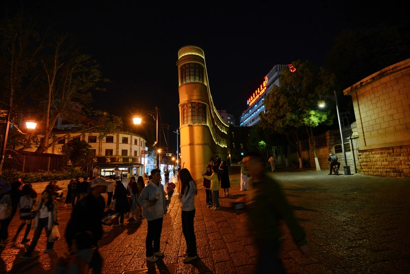 夜晚昆明胜利堂附近的“酒杯楼”前,民众熙熙攘攘打卡拍照。