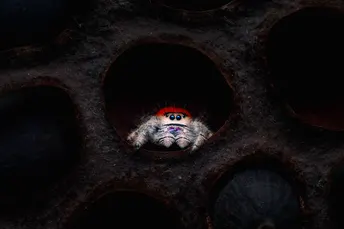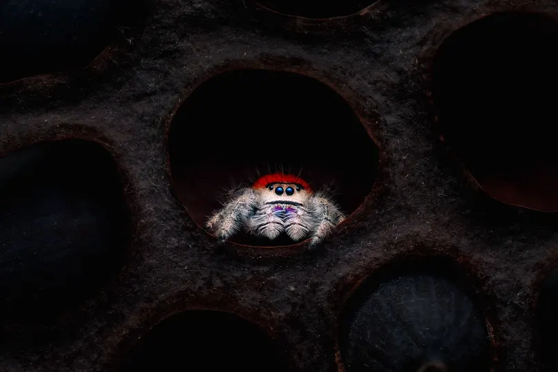 一只呆萌的佛罗里达跳蛛躲在莲蓬里