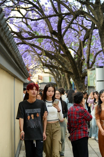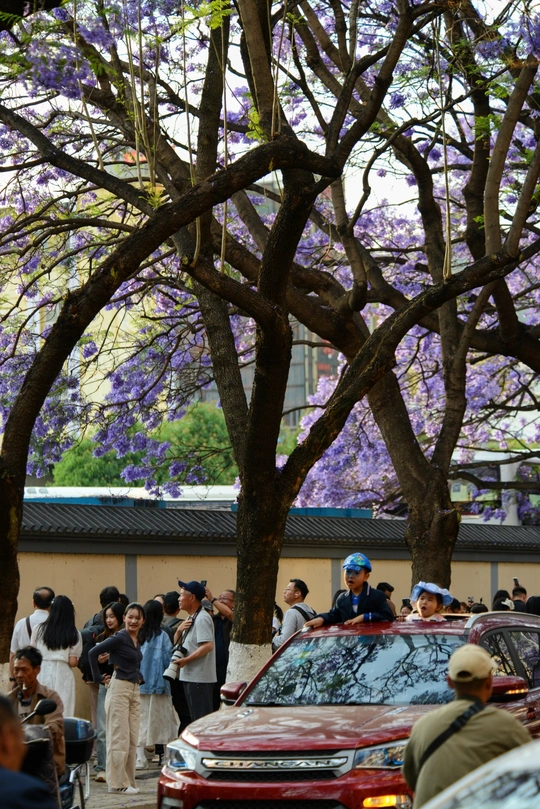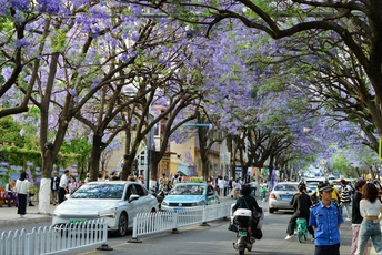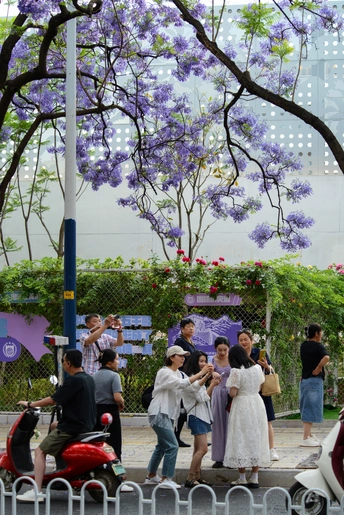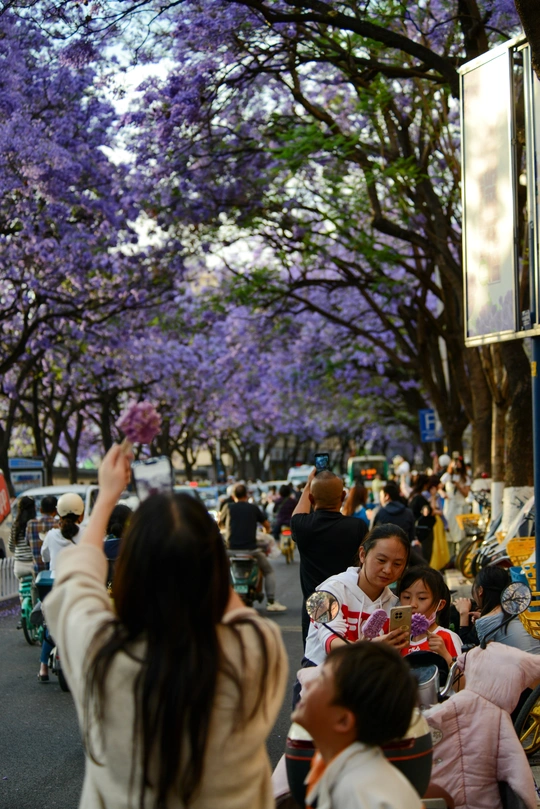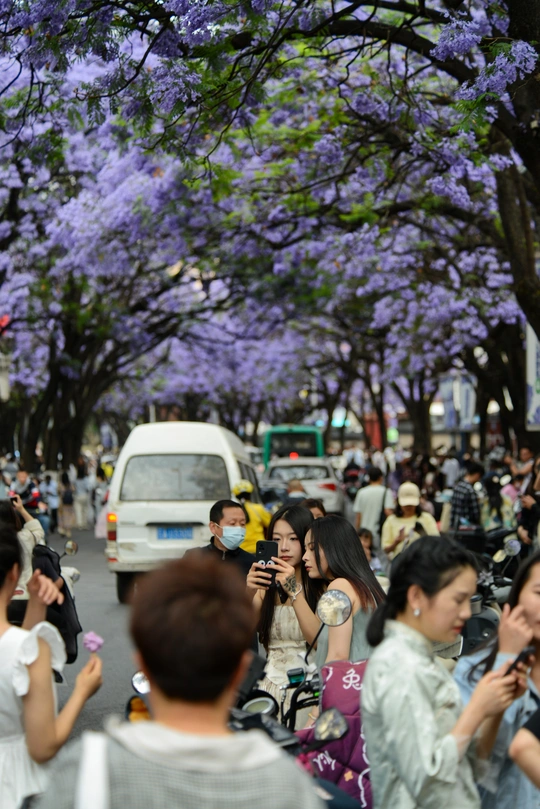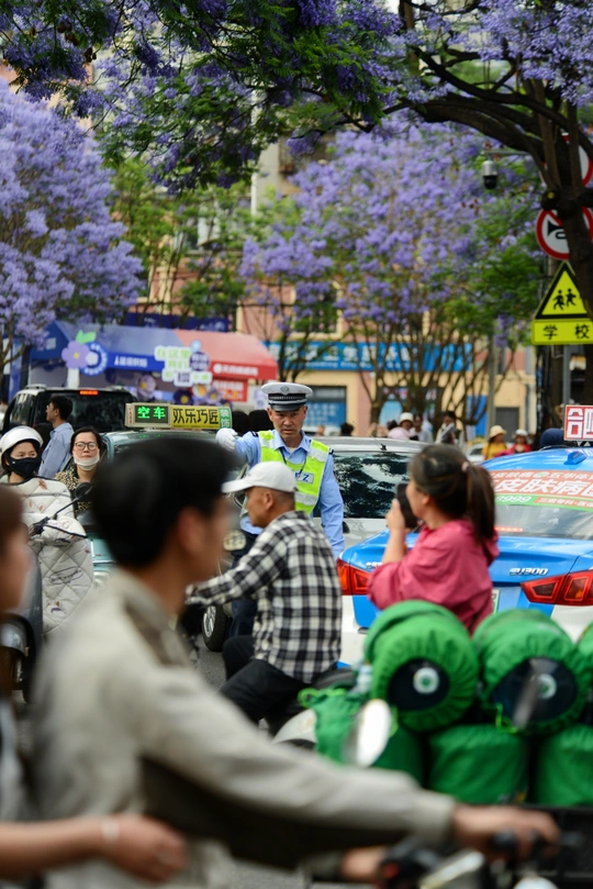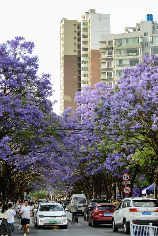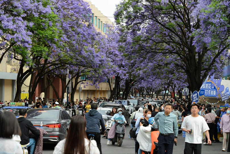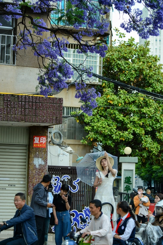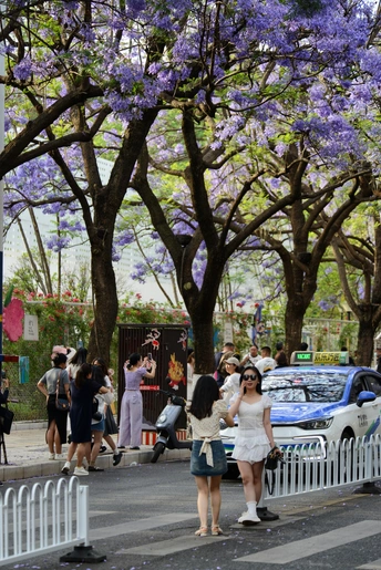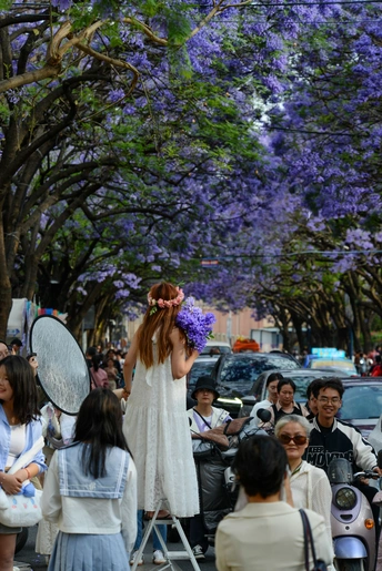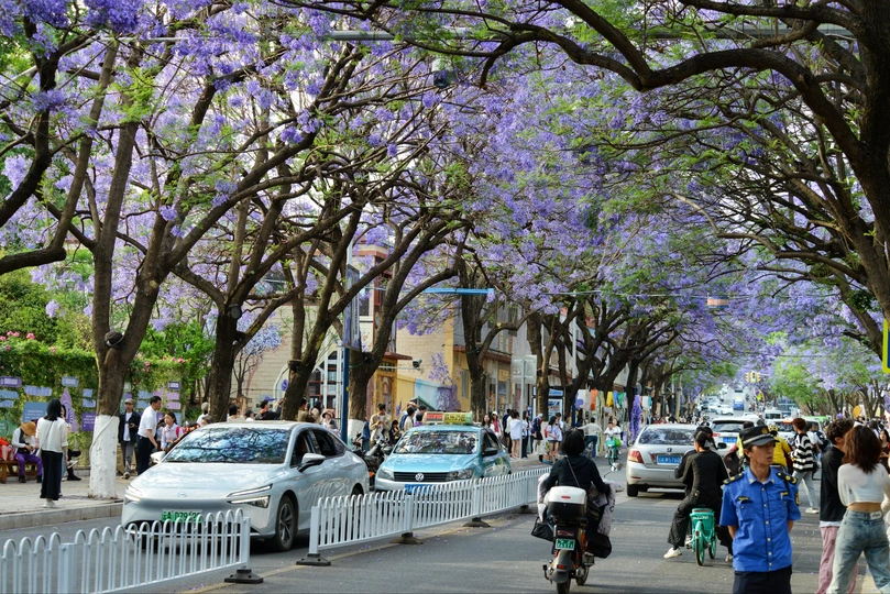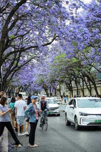 四月中下旬,昆明教场中路的蓝花楹如约绽放,使这里成为人潮涌动的网红打卡地。