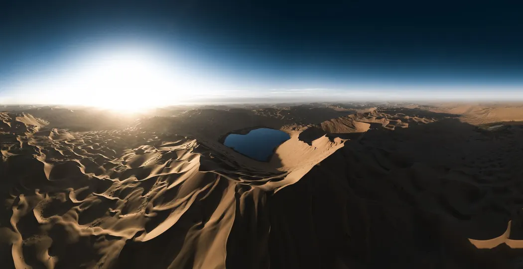 巴丹吉林之心|180度全景接片 当天空无细节时尝试了一下压低天空曝光度,营造出一种大气层之外太空的感觉。 📍巴丹吉林沙漠达布苏图附近的爱心湖
