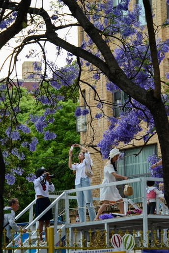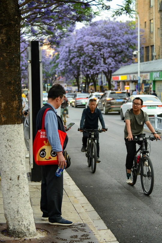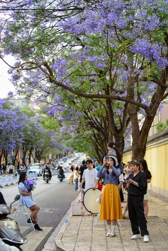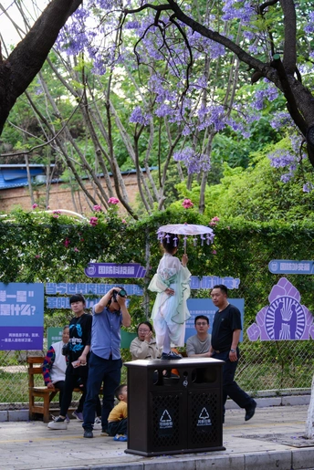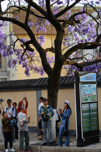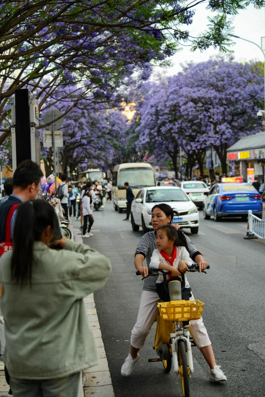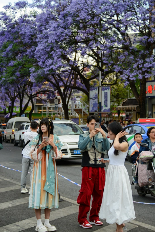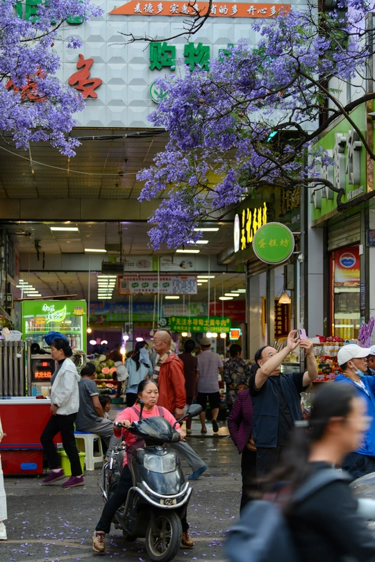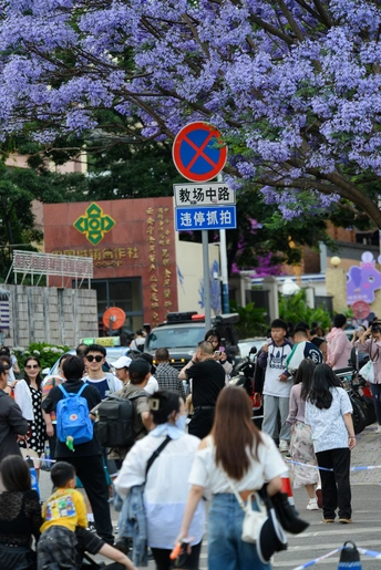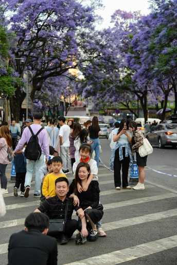 昆明教场中路蓝花楹的看点除了漫天缤纷的蓝紫,还有熙熙攘攘打卡拍照的人群。