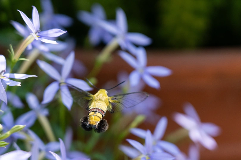 学校花丛中遇到一只咖啡透翅天蛾,一开始还以为是蜂鸟蝶蛾。