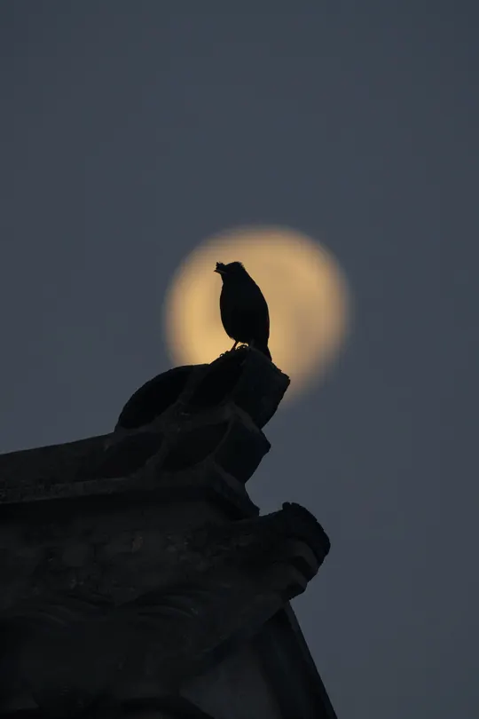 清晨,惠山古镇屋檐上的八哥鸟与落月同框。为了捕捉到这一刻,我没有吝啬使用高感光度,毕竟能拍到才是第一位的。