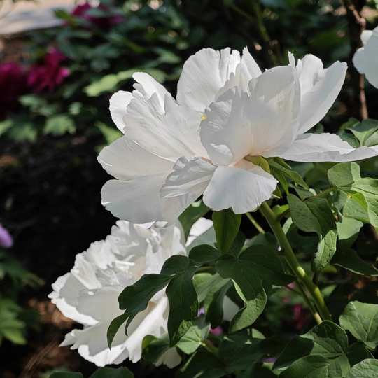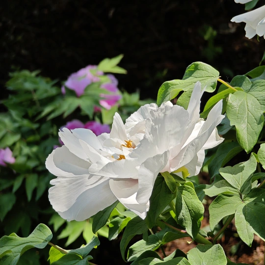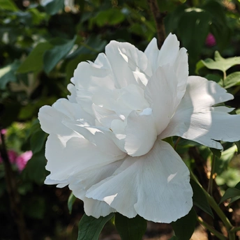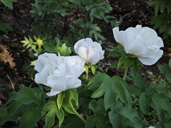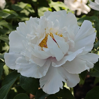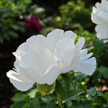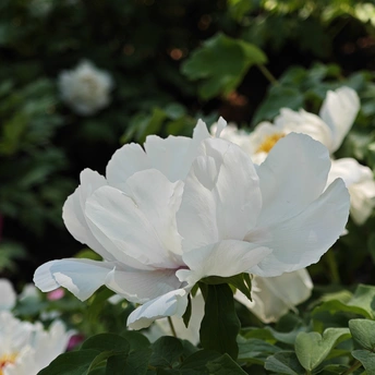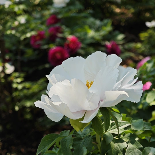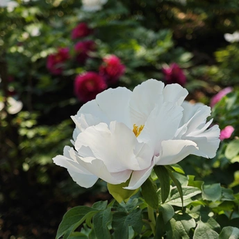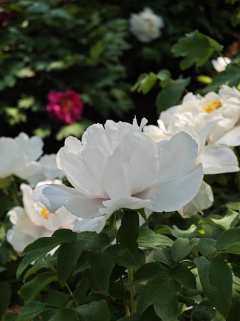 千红万紫斗芳春,羌独生成洁白身。 似厌繁华存太素,甘抛富贵作清贫。 琼葩到底羞争艳,国色原来不染尘。 昨夜月明浑似水,只疑瑶岛集仙真。 ——清·潘韶《咏白牡丹》