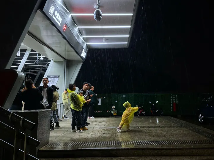 被大雨困在地铁口,大人和小孩的心情是完全不同的。