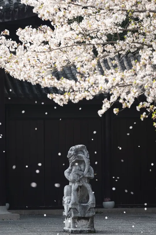 拍摄樱吹雪,最重要的是找一处暗背景,这样可以突出飘落的花瓣,然后就是静静地等风来了。当然,等待的过程如果没有三脚架的话胳膊会挺酸?