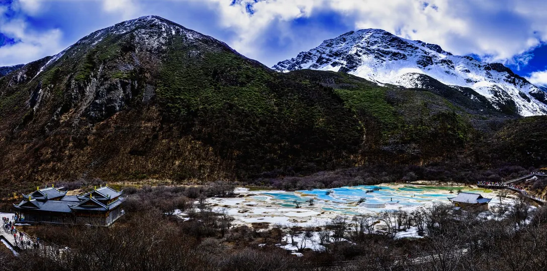 海拔3558米的黄龙中寺,古朴雄伟,塑像精美,藏汉民族宗教相互融合,体现了中国天人合一、阴阳转化的宇宙观。其后是世界上规模最大、海拔最高的露天钙华彩池群,池堤错落,池水漫溢,宛如片片碧色玉盘,在阳光照射下,呈现色彩斑斓的五彩景象。