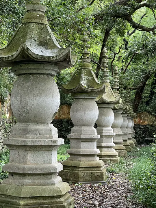 这幅图像展示了一排排古老的石灯笼,它们排列在一条小径上,周围是郁郁葱葱的树木和灌木。这些灯笼的设计精美,顶部呈弯曲形状,给人一种宁静而神秘的感觉。这样的场景常常让人联想到历史悠久的寺庙或园林,是东方文化中常见的元素。