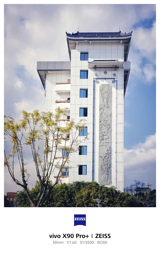 这座办公大楼在光影的交织下熠熠生辉,而背景中的蓝天则为其增添了一抹清新的色彩。