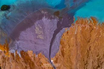 通过人工向尾矿库排放铜矿尾矿,形成冲积扇,金属、铜离子、土壤颜色形成强烈冲突。