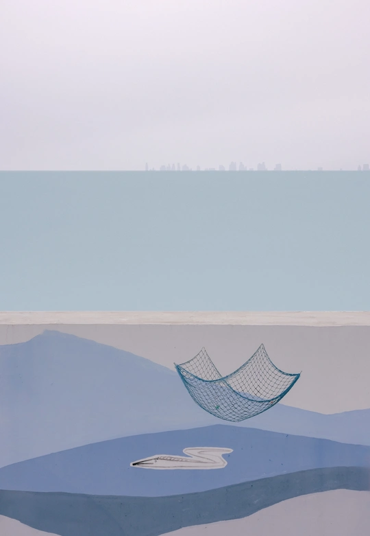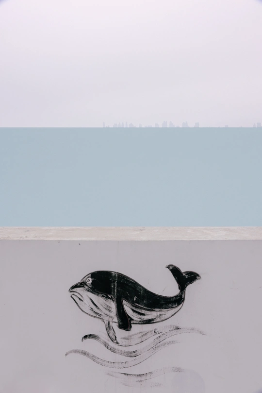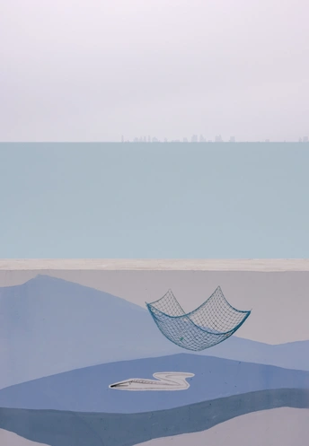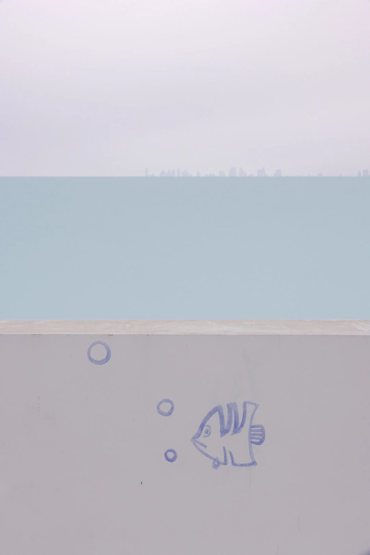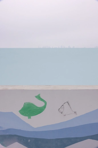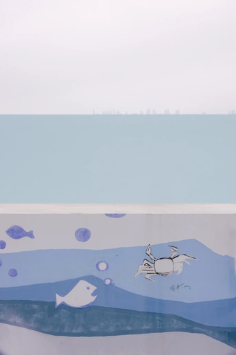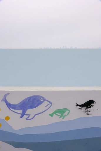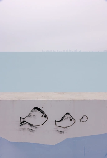 一群海边的壁画上的寻找回家道路的小鱼。也许背后的大海才是他们的家园。