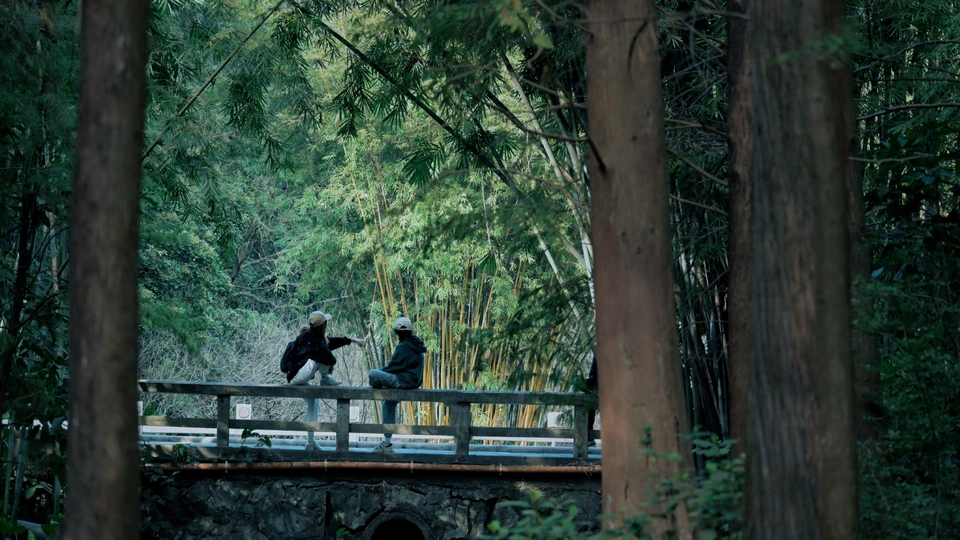 两个女孩坐在护栏上聊天,看她们的兴奋劲,手舞足蹈了。