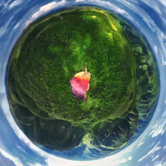 贵州龙里摆惹的废弃铁尾矿,通过球形全景图的方式拍下,看起来宛如绿色星球的红色心脏。