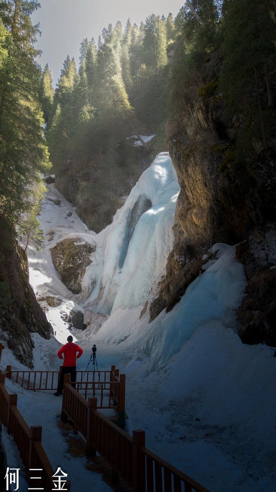 我徒手从下面结冰的栈道爬上来,却忘了考虑如何下去的问题。用DJI mini3给自己留念