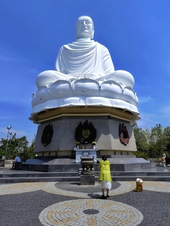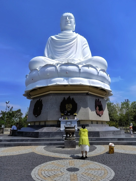2024年5月18日拍摄于越南芽庄隆山寺,一女游客在释迦摩尼白像下虔诚拜。
