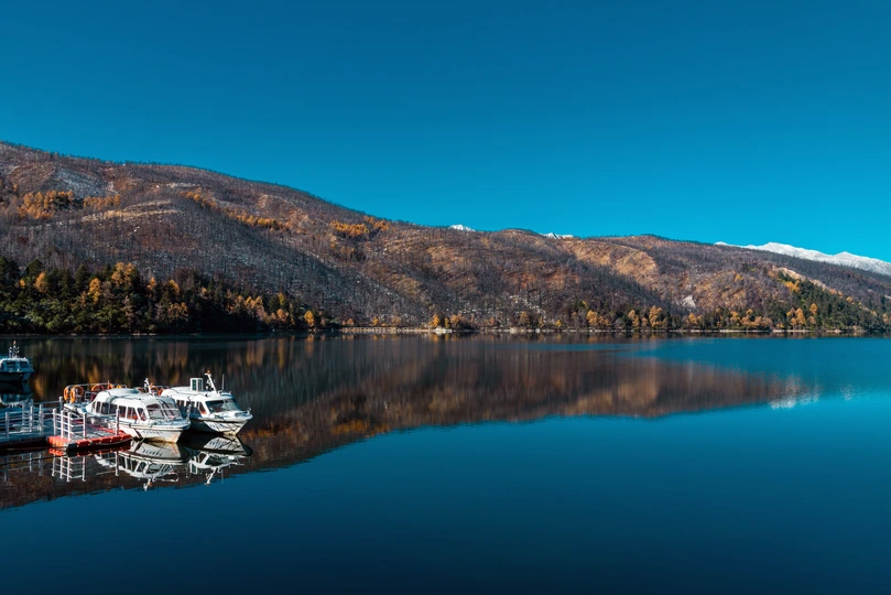 深秋中的木格措,雪山、彩林和宁静的野人海