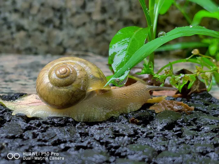 软体生物大蜗牛雨中缓慢前行