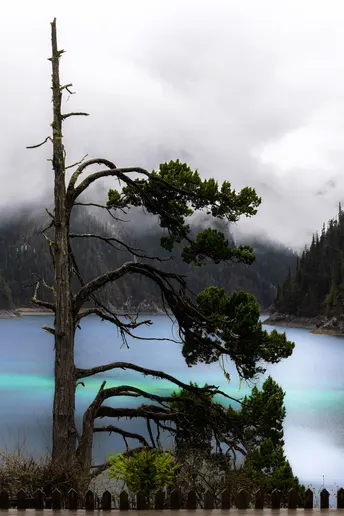 在九寨沟长海的北侧入口和湖岸,有一棵造型奇特的独臂老人松。它的一侧枝叶横生,另一侧则秃如刀削,宛如一位伸出独臂欢迎游客的老人。这棵树的存在,为长海增添了一抹神秘的色彩。