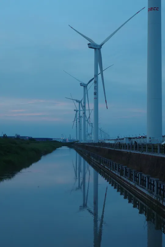 风力发电机组正对大海,背后还有一条河道。傍晚,夕阳的余光逐渐褪去,天水一色,映衬着不停运转的风机。