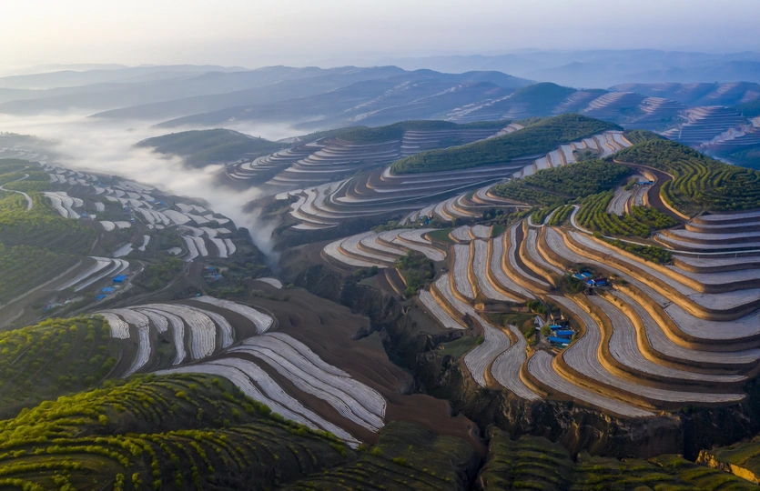 春季,村民在旱梯田的地垄上覆盖塑料地模种植玉米,待到劳作完成时使旱作梯田为一体的一道道地膜玉米,宛如一条条玉带闪着点点银光,蜿蜒游走在层层叠叠的梯田之上。