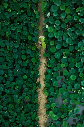 在宝胜村荷塘月色,偶遇采莲人满载归来!