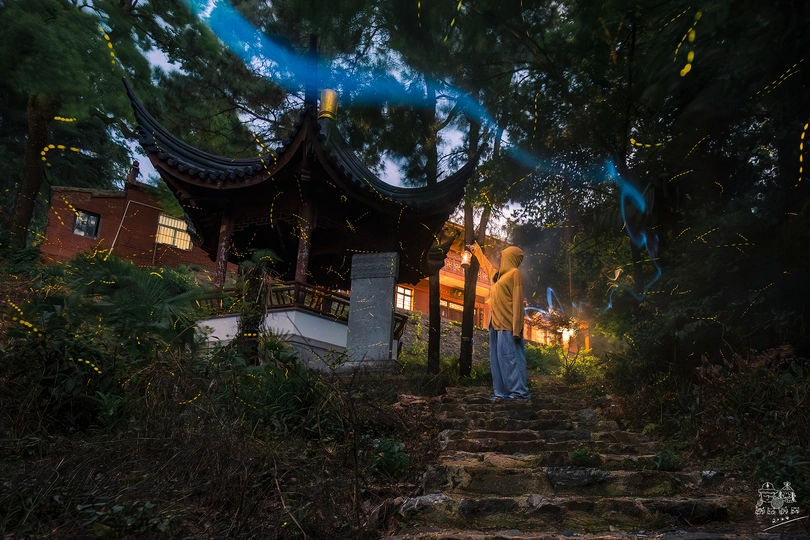 周日,再次去兜率寺拍萤火虫,选了一个后门的机位,但由于是广角,拍不了最常规的角度,只能架在了台阶上,并让老婆在天黑前拍了前景。天黑后,这边的萤火虫还不少,但寺庙后面的灯太亮了,且经过的游客开灯的也过多,导致废片率很高。最后,星星点点,四十张堆栈,才有了萤火虫很多的样子,并搭配上一张游客的光绘照,有了一种很神奇的感觉。但最后总结来看,我的技术还用不了广角来拍萤火虫。