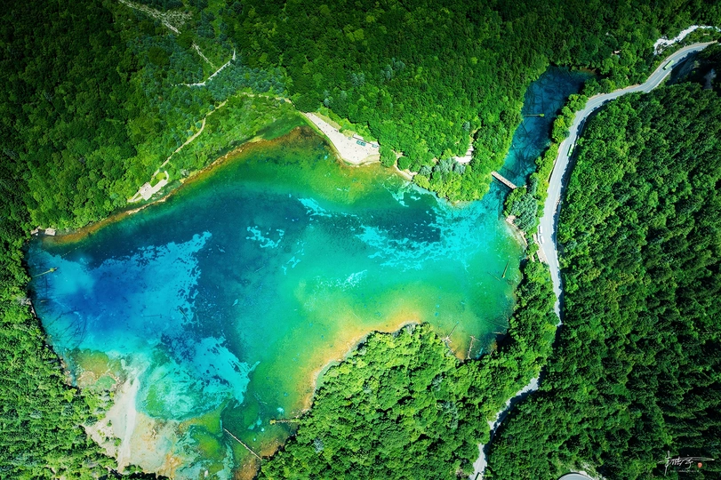 有“九寨沟一绝”之誉的五花海,从空中俯瞰因其形态酷似一只正在开屏的孔雀,故又名“孔雀海”,当我的无人机飞至500米高空才发现果然名不虚传。