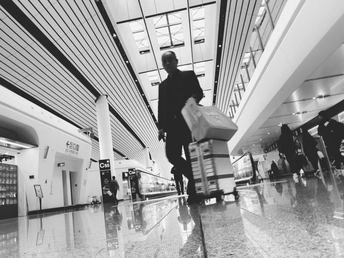 机场里游历的旅人不知正赶向何方,黑白的线条交织下匆忙的身影定格在此刻。