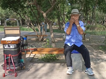 音响,话筒,口琴,夏日的晨光里,老人在尽情地吹奏内心的快乐。