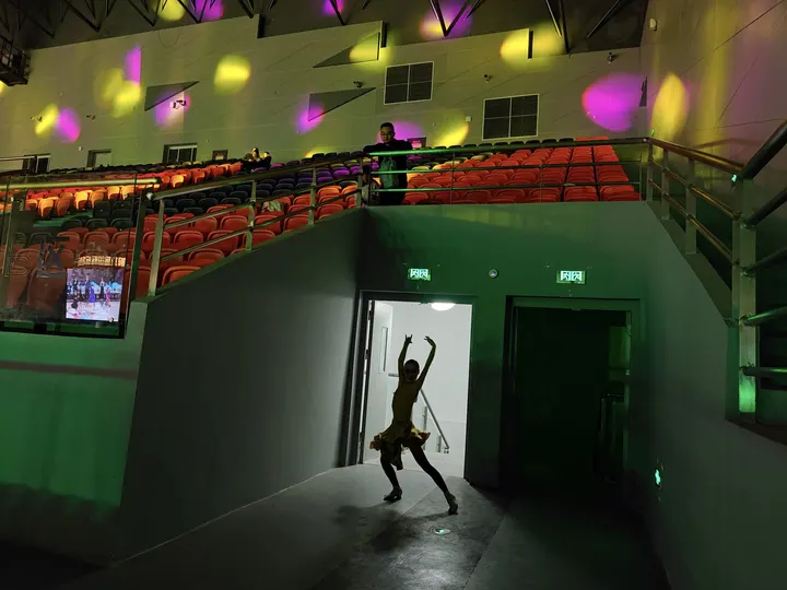 体育馆里的一场青少年们的舞蹈比赛,正在看台上热身演练的小舞者。