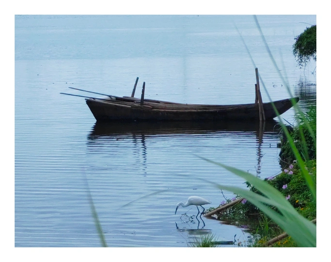湖中小船悠然,犹如一水墨画。
