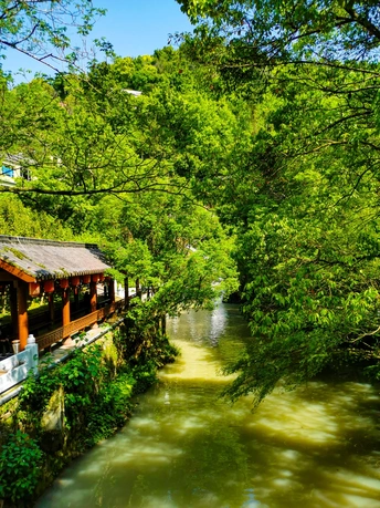 青山绿水间有一个供人们休息的长廊,醒目且美观,创造出了清新的氛围,展示了自然风光和建筑的融合,给人以宁静和谐的感觉,让人心灵放松,传递出人文与自然和谐共存的理念。