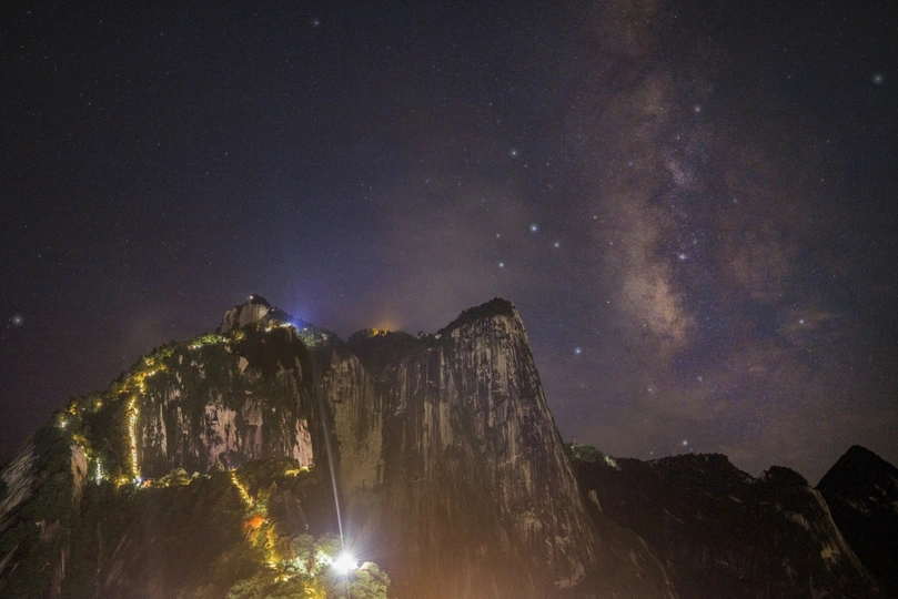 华山,古称"西岳",雅称"太华山",为五岳之一,位于陕西省渭南市华阴市,在省会西安以东120千米处。南接秦岭山脉,北瞰黄渭,自古以来就有"奇险天下第一山"的说法。华山五峰环峙,最高峰南峰海拔2200米,为五岳中最高者。