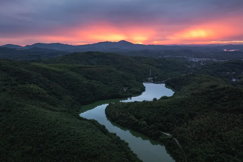 远方,晚霞红透半边天;近处,蜿蜒的水系已经失去阳光照射,透着冷色。使用大疆御3Pro包围曝光拍摄。