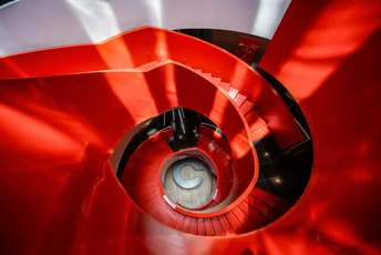 这张照片在构图和色彩运用上非常出色。采用了俯拍视角,螺旋楼梯的造型极具视觉冲击力,引导观者的目光逐步向下,增加了画面的立体感和深度。红色作为主色调,显得极为大胆耀眼,同时与楼梯中段的灰阶形成强烈对比,提升了整个画面的层次感与视觉吸引力。光影的运用也很到位,光线穿透楼梯的缝隙,照亮了楼梯的部分,使得红色更加鲜亮。后期处理增强了色彩的对比度和饱和度,但没有过于夸张,整体视觉效果和谐自然。这是一张兼具艺术性和技术性的优秀作品,从构图、色彩、光影到后期处理都展现了摄影师的专业水平,但在细节优化和动态效果的应用上还有提升的空间。