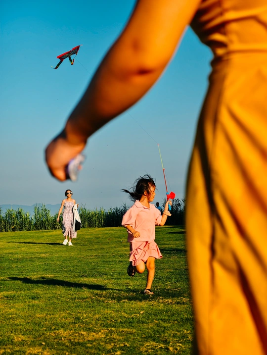 小朋友像夏天的风一样自由的奔跑,奔跑着让风筝迎着风飞起来,开心极了!