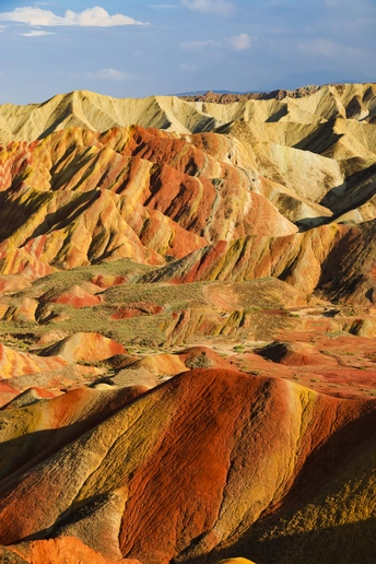 张掖七彩丹霞位于‌甘肃省张掖市‌临泽县和‌肃南县境内,是中国北方干旱地区发育最典型的丹霞地貌,也是国内唯一的丹霞地貌与彩色丘陵景观高度复合区。该景区总面积约为50平方公里,以其丰富多彩的色彩、独特的地貌形态和深厚的历史文化底蕴吸引着无数游客前来探访。七彩丹霞景区以其面积大、集中、层理交错、岩壁陡峭、造型奇特、色彩斑斓而著称,拥有红色、黄色、白色、绿蓝色调,形状有顺山势起伏的波浪状,也有犹如斜铺的彩布,在阳光的照射下熠熠泛光,色彩异常艳丽。