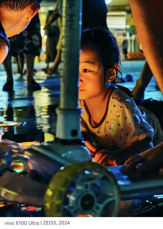 小朋友趴在地上玩水,出神的望着水面绚丽的光。