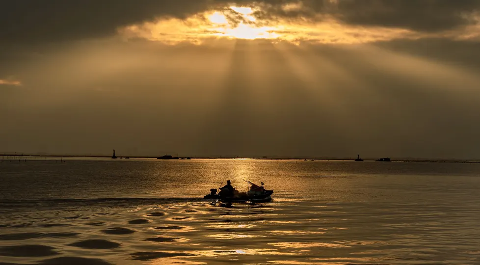 傍晚时分 最后一抹夕阳洒在海面上,金色的光芒与波光粼粼的海水交织在一起,形成一幅美丽的画卷。此时,一艘渔船迎着光芒归航,渔船的船体在光线的映照下显得格外鲜明。这艘渔船正在追逐着光线,同时也在追逐着海洋中的渔获。