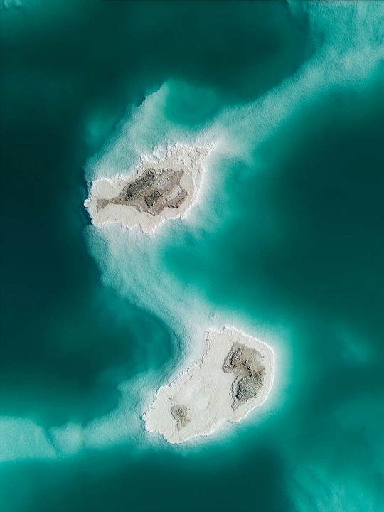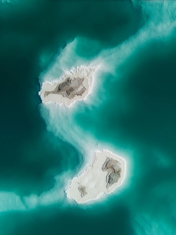 在大柴旦翡翠湖发现其中的两个小岛屿,正好构成了阴阳图形,深绿色又给人一种深邃的感觉