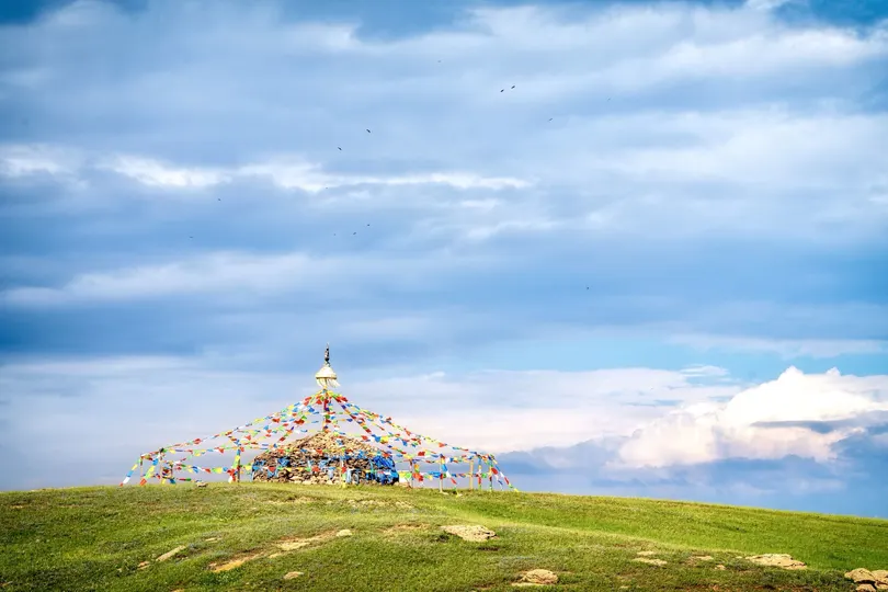 在辽阔的草原上,一座玛尼堆静静地矗立在山丘上,五彩斑斓的经幡在微风中轻轻摇曳,仿佛在诉说着古老的祈愿,几只飞鸟点缀着高远的天空,给这片宁静的土地增添了几分灵动。阳光洒在草地上,青草的绿意与经幡的色彩交相辉映,构成了一幅恬静而神圣的画面,仿佛时间在此刻静止,只剩下无声的祝福在天地间回荡。