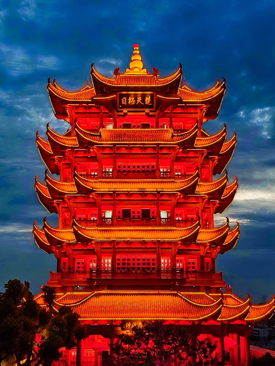 黄鹤楼采用了典型的中国传统楼阁式建筑布局,结构严谨,层次分明。楼体高大雄伟,气势磅礴,展现出古代工匠精湛技艺和卓越的智慧。