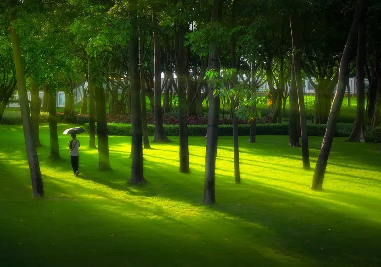 清晨的第一缕丁达尔光透过树丛指引前进的方向