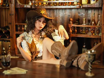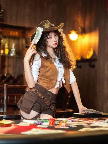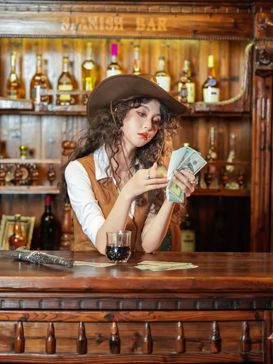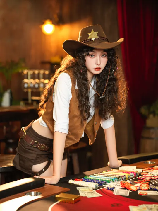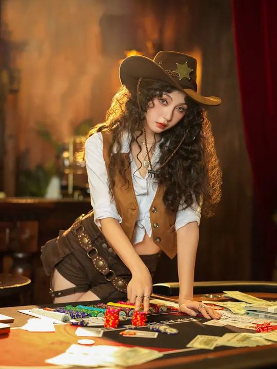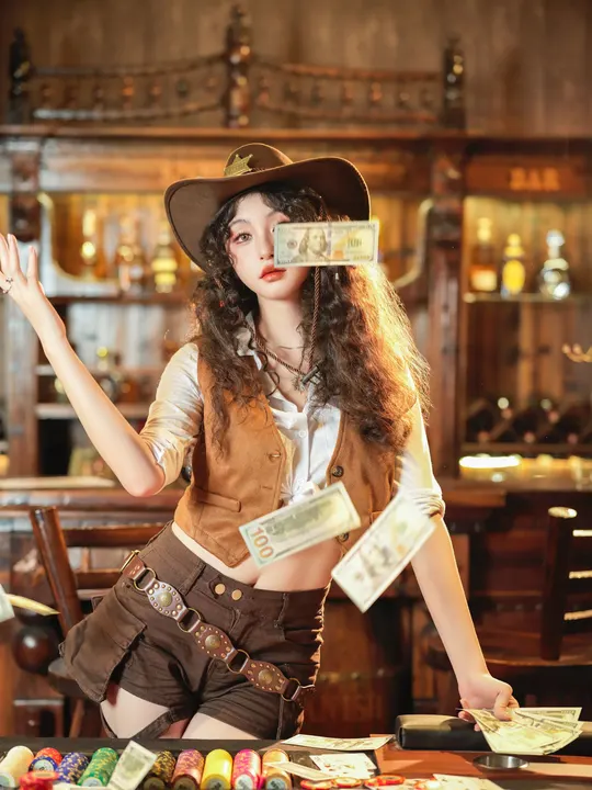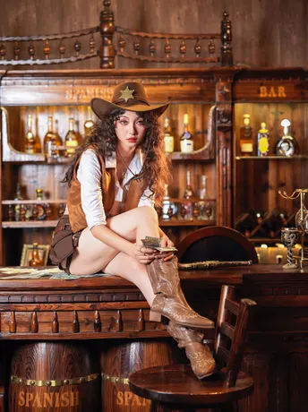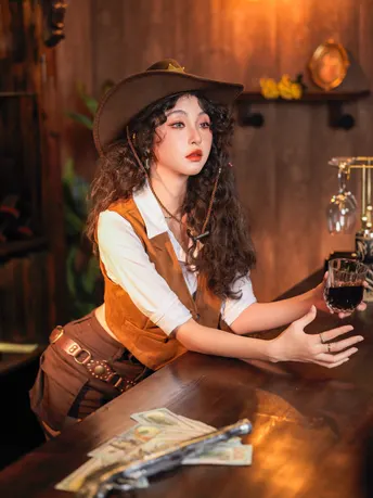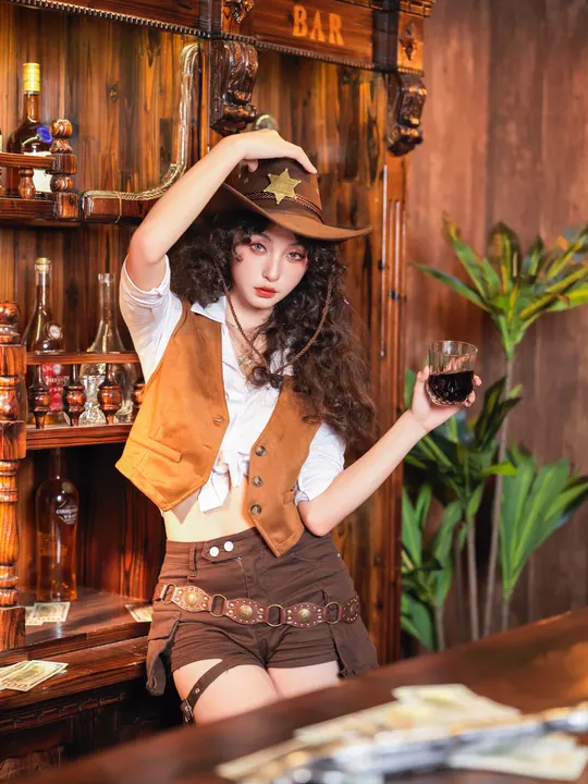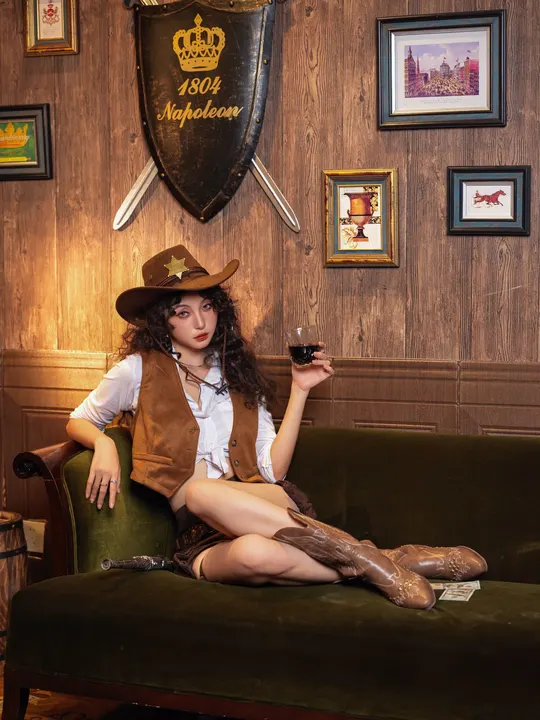 充分利用了道具房的灯光布置和装饰,营造了美式西部牛仔酒吧写真,温暖的橙色凸显怀旧和复古。牛仔帽,马甲,马靴展示了西部牛仔狂野不羁的性格。充满了神秘和危险的感觉。