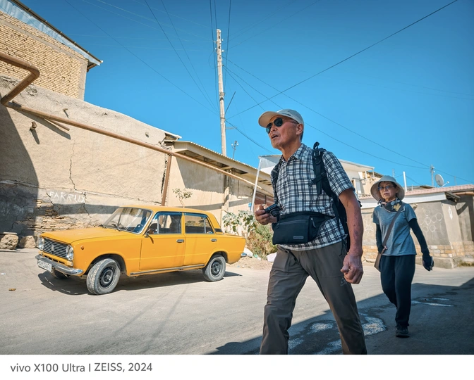 一对老年游客,拿着相机在小街小巷里记录这美丽的一天